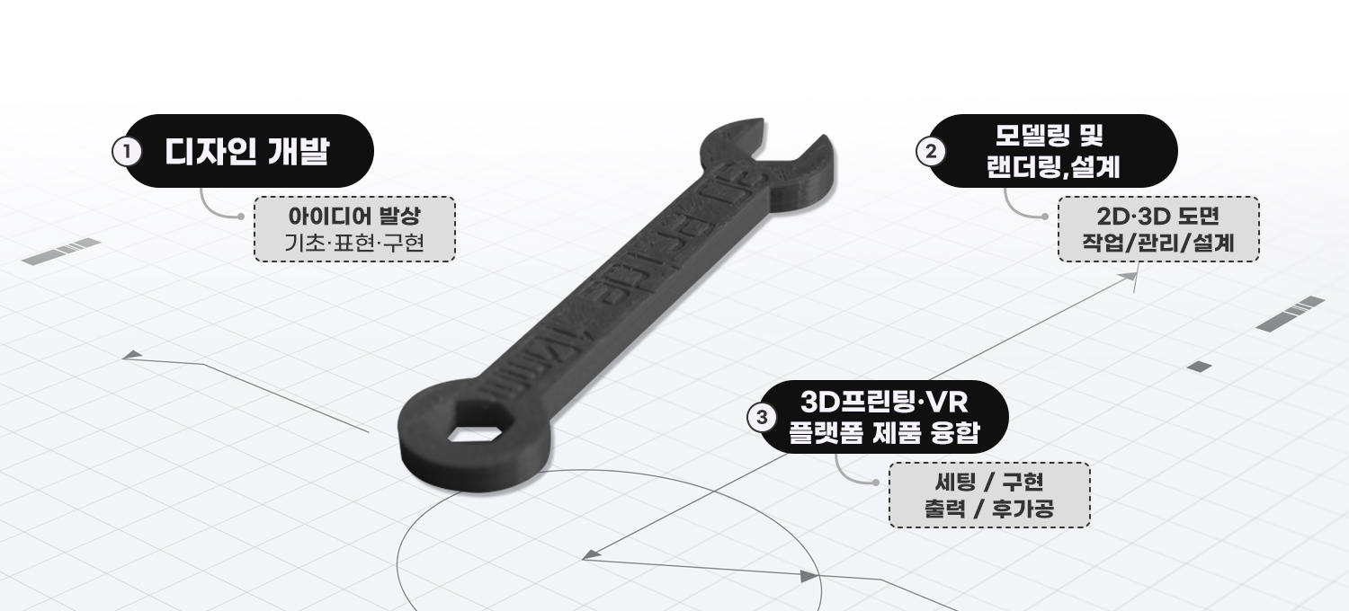 2D/3D 설계로 제품모델링을 구현하며 3D 프린터를 이용하여 시제품 출력·제작이 가능하고 VR 플랫폼을 이용하여 3D 콘텐츠를 디자인할 수 있습니다.