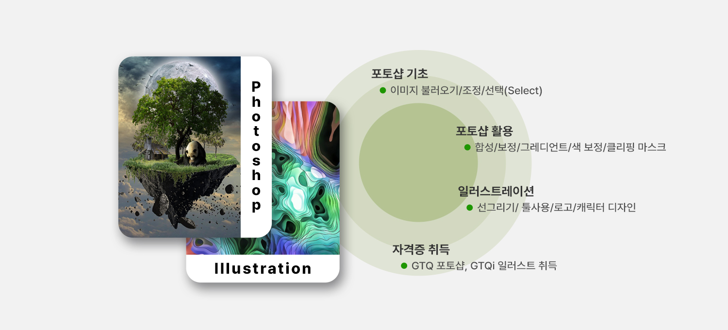 취준생, 초보자 및 비전공자 누구나 디자인 감각이 없어도 학습이 가능하며 GTQ 포토샵, 일러스트 자격증을 위한 훈련 뿐만아니라 실무위주의 교육과정을 통해 업무향상/취업까지 성공!