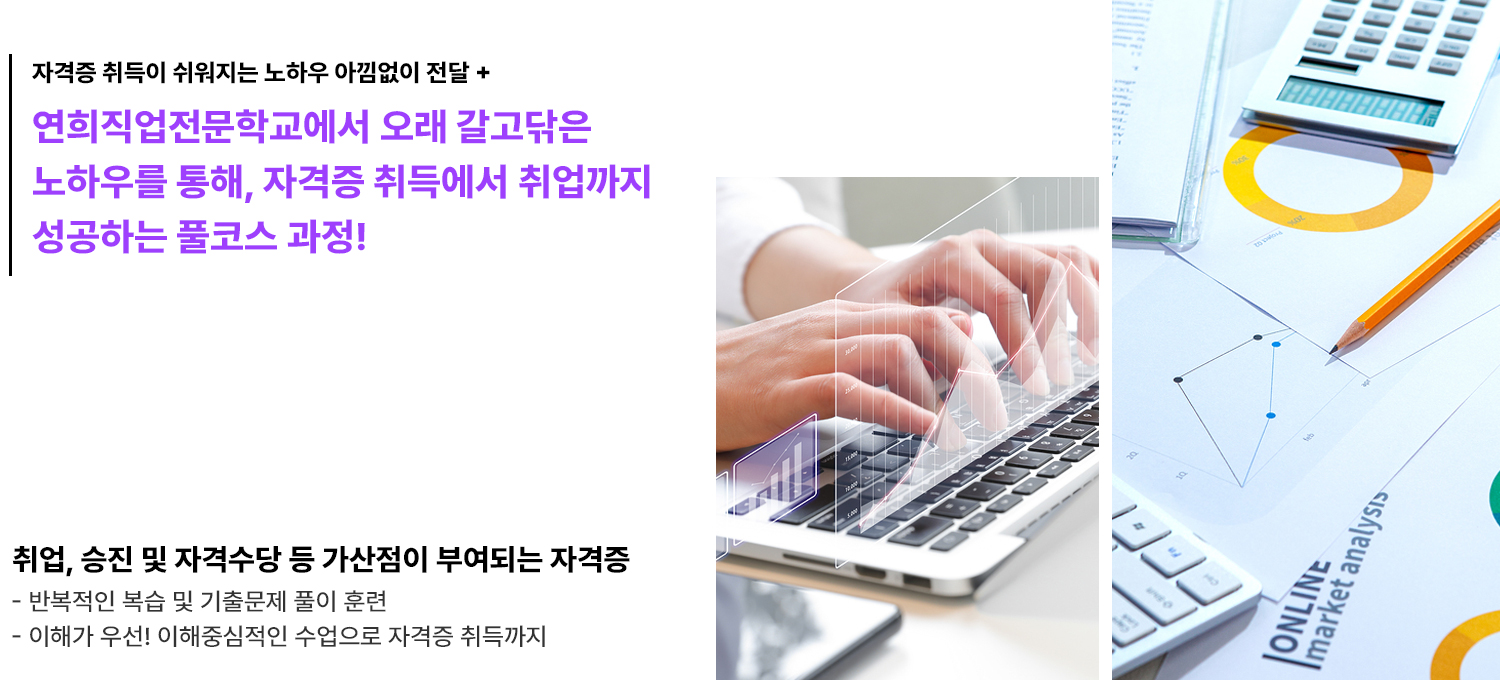 실무 맞춤 자격증 취득 훈련 : 기초부터 학습하여 자격증 취득에서 실무까지 적용가능한 커리큘럼으로 보다 전문적인 인재를 양성합니다.